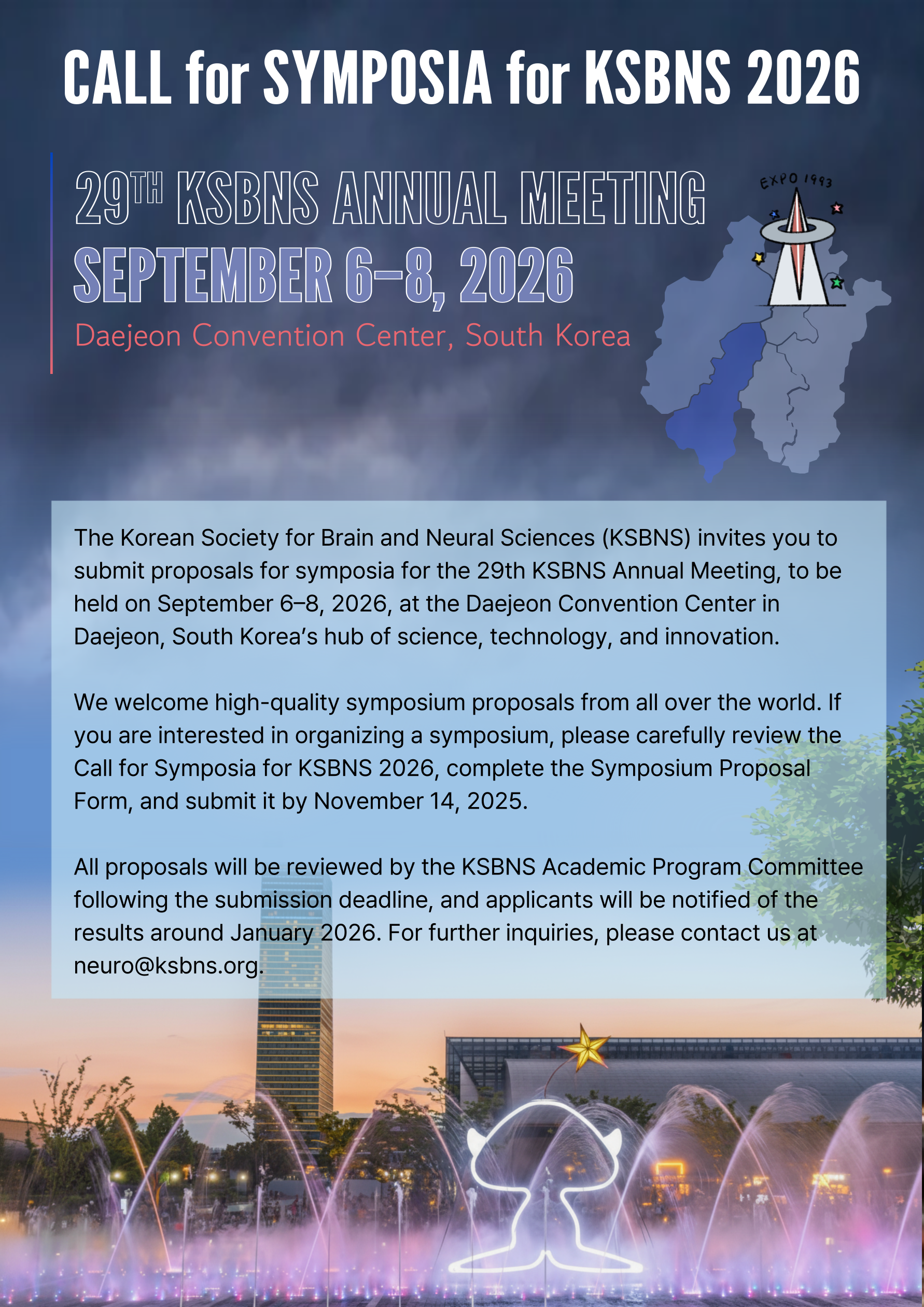 대한뇌신경과학회(KSBNS)에서 2026년도 학술대회 심포지엄 제안서 공모를 진행하고 있어 회원 여러분께 안내드립니다.